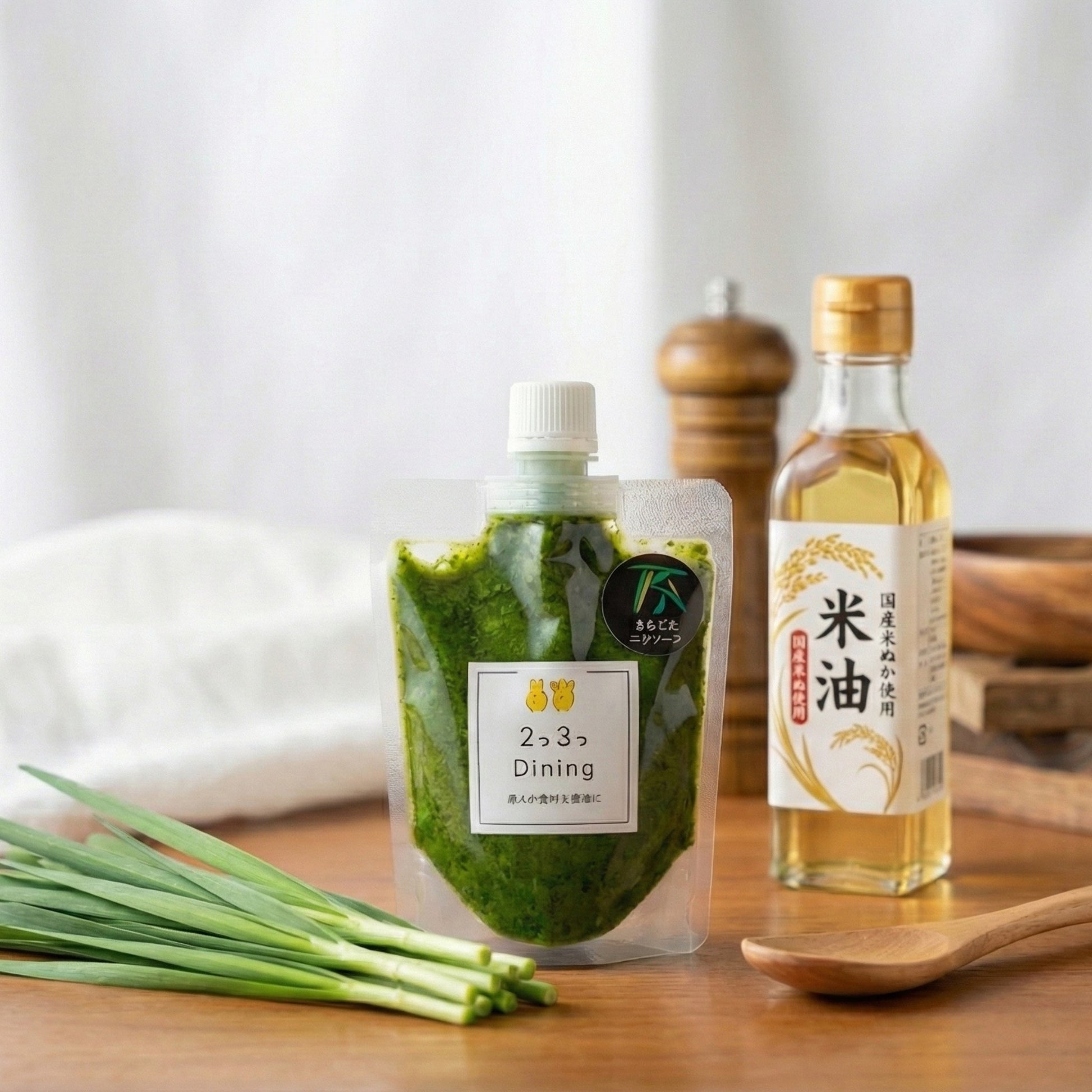 まるごとニラソース: 栃木県産ニラをまるごと使用した、鮮やかな緑と香りが特徴の「まるごとニラソース」。ニラ本来の風味をそのまま閉じ込めるため、特殊な製法で色と香りをキープ。肉料理・魚料理・パスタ・豆腐・など、和洋中どんな料理にも使える万能ソースです。添加物控えめで素材の味を引き立てる、プロ仕様のお取り寄せ調味料として人気です